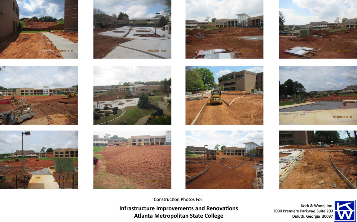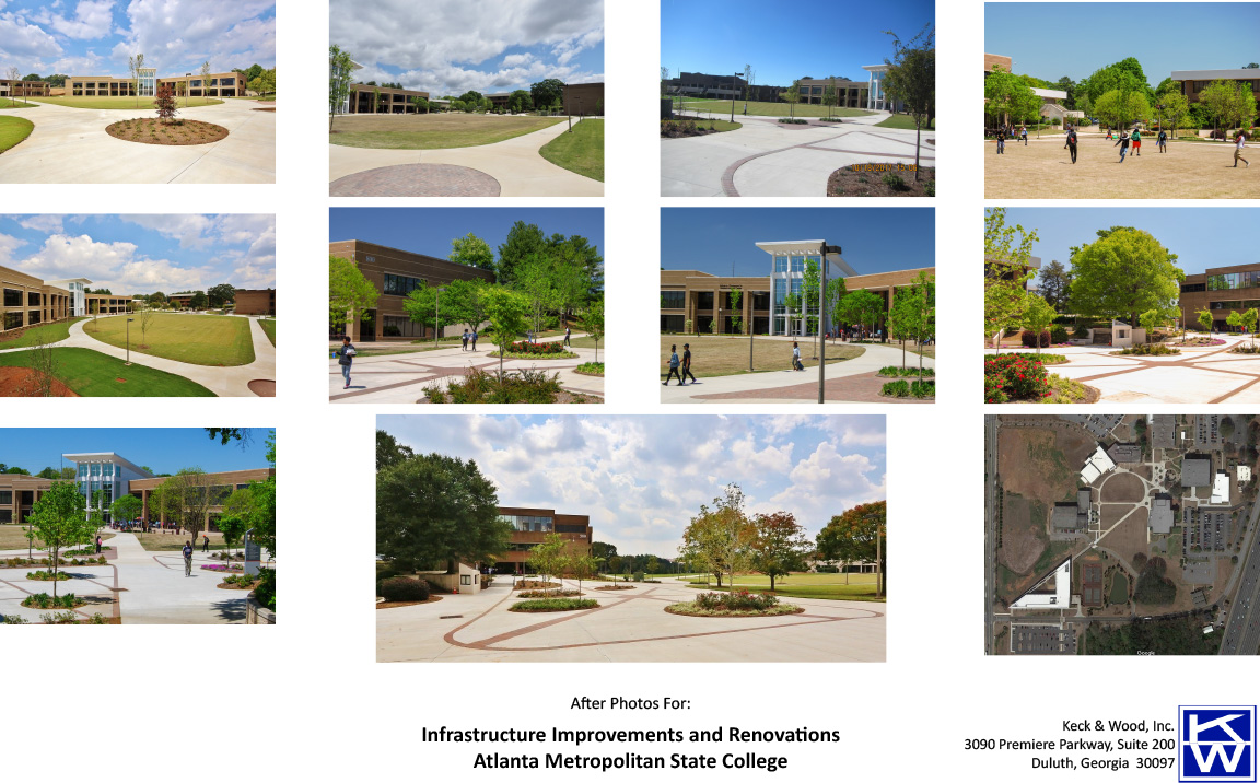 The project involved removing 25,000 cubic yards of fill dirt from the embankment between Metropolitan Parkway and campus buildings, relocating it to create a level central lawn for student use and outdoor events. Walkways were redesigned to meet ADA requirements, and a new concrete and paver plaza was built, along with improved lighting and landscaping. The primary campus roadway was widened and reconstructed, while a gravel parking area was transformed into a paved lot with 135 stalls.