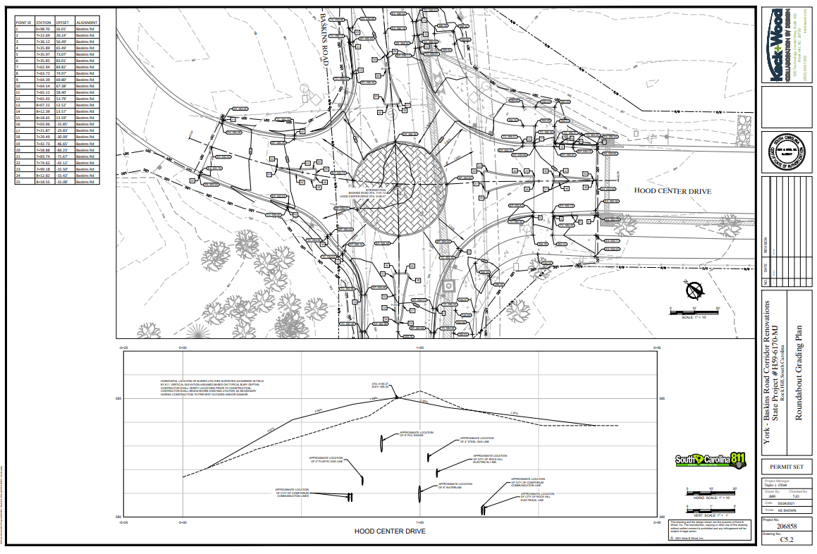 The sketch plans prepared by Keck + Wood show that the westernmost Baxter Hood Center entrance (Intersection #13A) would be disconnected from Baskins Road, while the campus loop road would instead tie in from the south (Intersection #13B). Once the campus loop road is connected to Baskins Road (Intersection #13B), the Entrance North of Building C (westbound approach of Intersection #6) is planned to be disconnected from Baskins Road. In Figure 4.1B, a mini-roundabout is shown at the Baskins Road/Hood Center Drive intersection (Intersection #15) for illustrative purposes, as an alternative to the unsignalized, two-way stop control intersection.