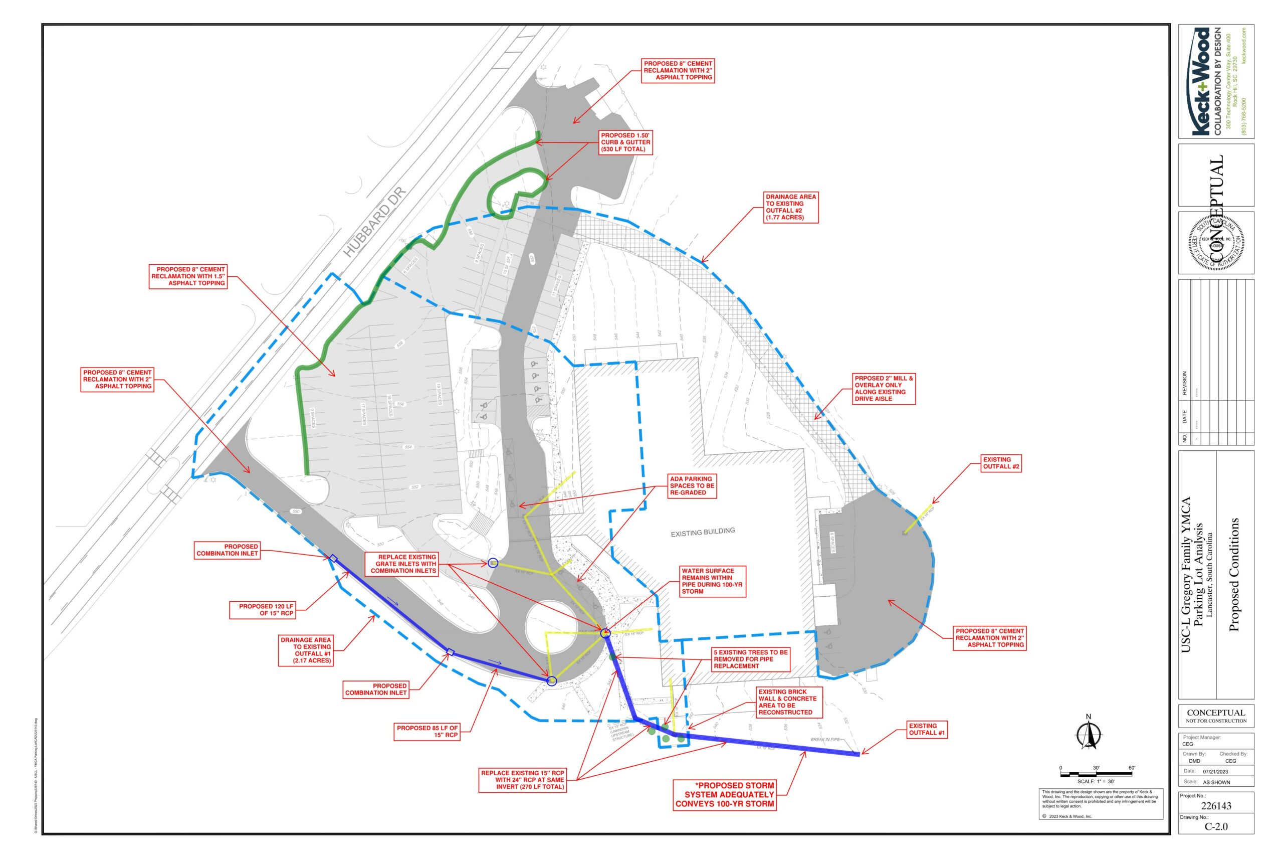 Keck + Wood conducted an existing condition and topographic survey of a courtyard and adjacent parking area at USC Union Campus to support design work by another consultant. The survey documented physical features, utilities, and elevations, providing a detailed topographic surface. Additionally, Keck + Wood is analyzing the YMCA’s parking lot to address drainage issues, upgrade ADA compliance, and develop conceptual plans for storm sewer improvements and spot grading.